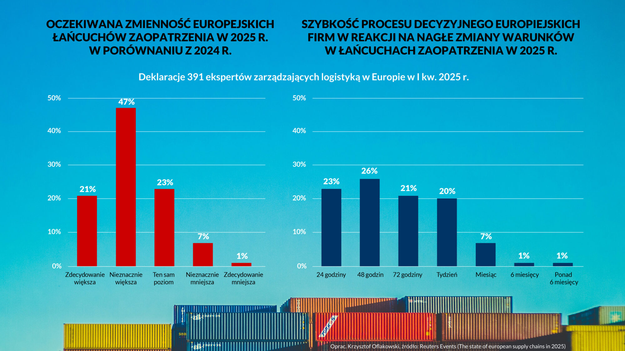Pomimo oczekiwanej dużej nieprzewidywalności europejscy eksperci są pewni co do tego, że będą w stanie podejmować szybkie i istotne decyzje w reakcji na kolejne zmiany regulacji i warunków w łańcuchach zaopatrzenia. W analizie Maersk i Reuters aż 23% zarządzających operacjami twierdzi, że może podjąć adekwatne i skuteczne kroki w ciągu 24 godzin. Dwie doby dla procesu decyzyjnego potrzebuje 26% badanych, natomiast 21% deklaruje, że znajdzie rozwiązanie w ciągu 72 godzin. Oznacza to, że 70% ekspertów w Europie będzie w stanie skutecznie odpowiedzieć na zmiany w ciągu maksymalnie trzech dni. Jeśli na podjęcie decyzji i wdrożenie odpowiednich planów potrzeba będzie tygodnia, to do wspominanych 70% dołączy kolejne 20%, co przy skali potencjalnych problemów daje imponujące 90% przedsiębiorstw gotowych do radzenia sobie z nowymi wyzwaniami.