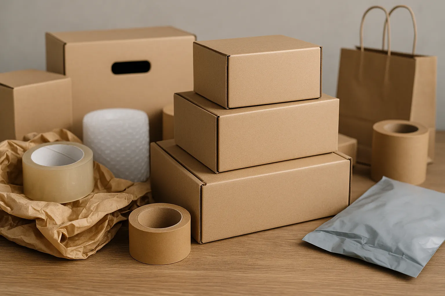 - Taśma klejąca: 1 rolka na 50 paczek (~0,001 kg plastiku na paczkę)