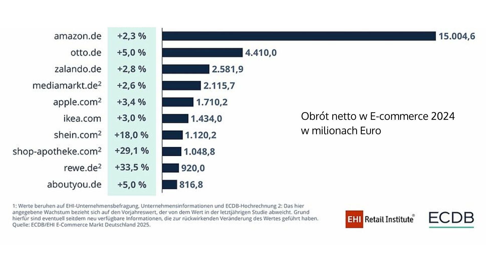 Wzrost jednak nie rozkłada się równomiernie. Największe znaczenie mają wyniki dziesięciu największych podmiotów, które nadają ton całemu rynkowi i koncentrują niemal 40 procent wartości niemieckiego e-commerce. W tej grupie Amazon pozostaje bezkonkurencyjny.