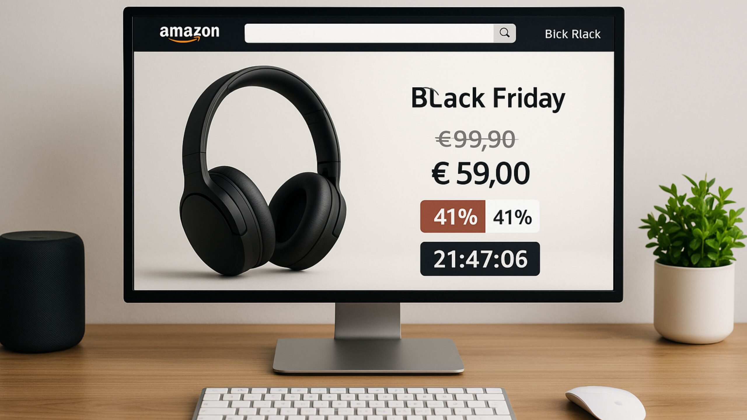 W listopadzie 2024 roku Amazon reklamował słuchawki bezprzewodowe jako część kampanii „Black Week”. Na stronie produktu pojawiła się przekreślona cena 99,99 €, rabat do 59 €, informacja o 41% zniżce oraz zegar odliczający czas promocji. Wszystko wyglądało jak typowa okazja na Black Friday. Problem? Po zakończeniu promocji cena nie wzrosła – przeciwnie, spadła do 49 €.